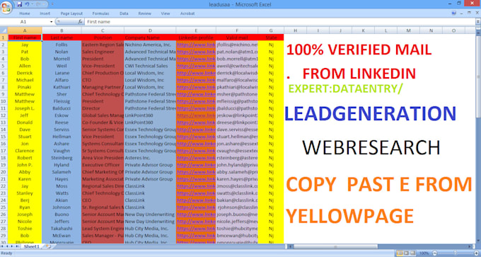 I'll be able to complete your job Properly That's 100% valid lead with your requirement.Before hire me you can take a short test to judge my skills and expertise.
